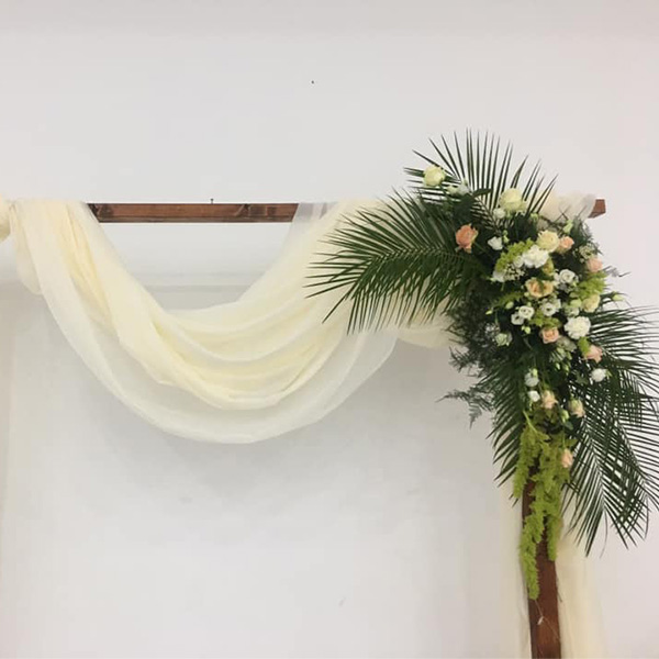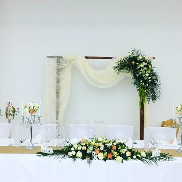 Dekoracija prostora je zelo pomembna saj poživi in vam popestri poročno vzdušje. Obok je primeren za matični obred na prostem, prihod neveste iz stanovanja, za cerkev…To si lahko izposodite pri nas v agenciji.