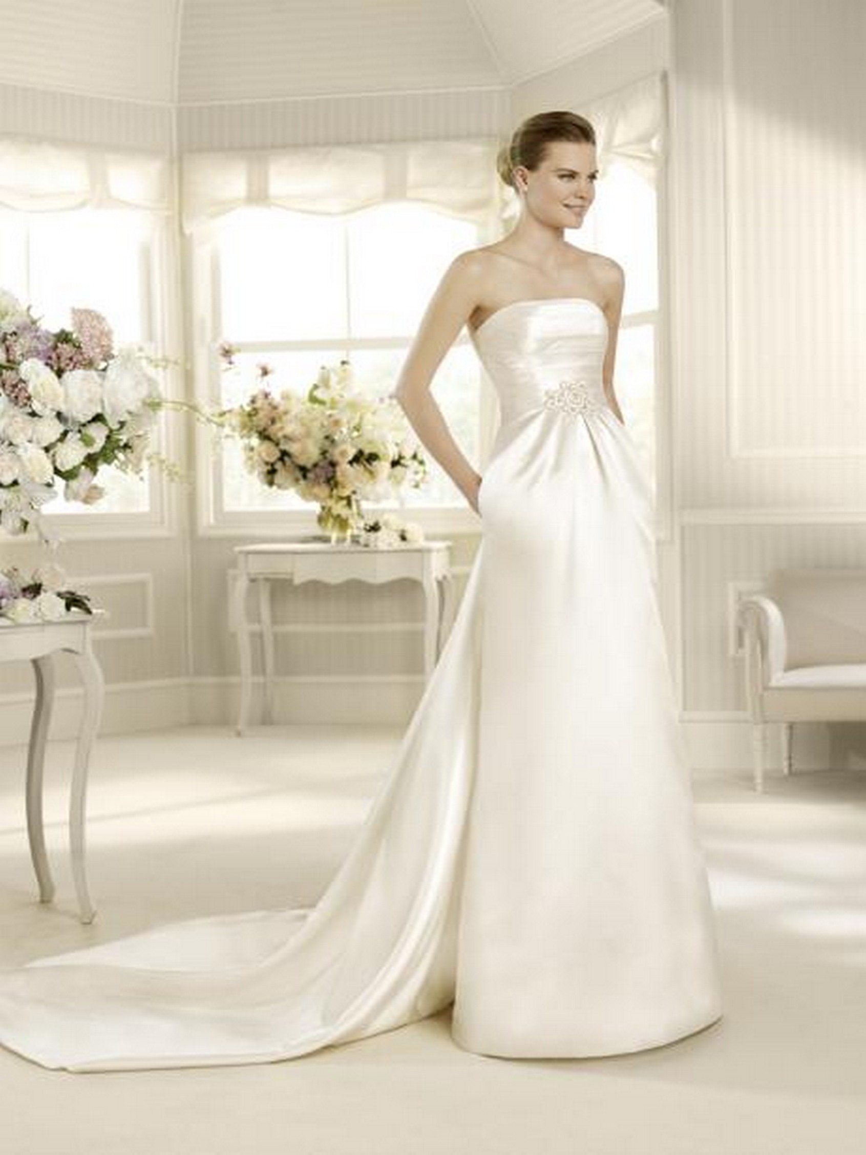 Obleka je narejena iz satena, je zelo klasičnega videza. V zgornjem delu je naguban saten.V višini pasa ima rožo iz kristalčkov in biserčkov. Obleka nima naramnic in se zapira na zadrgo. Ima tudi vlečko.
