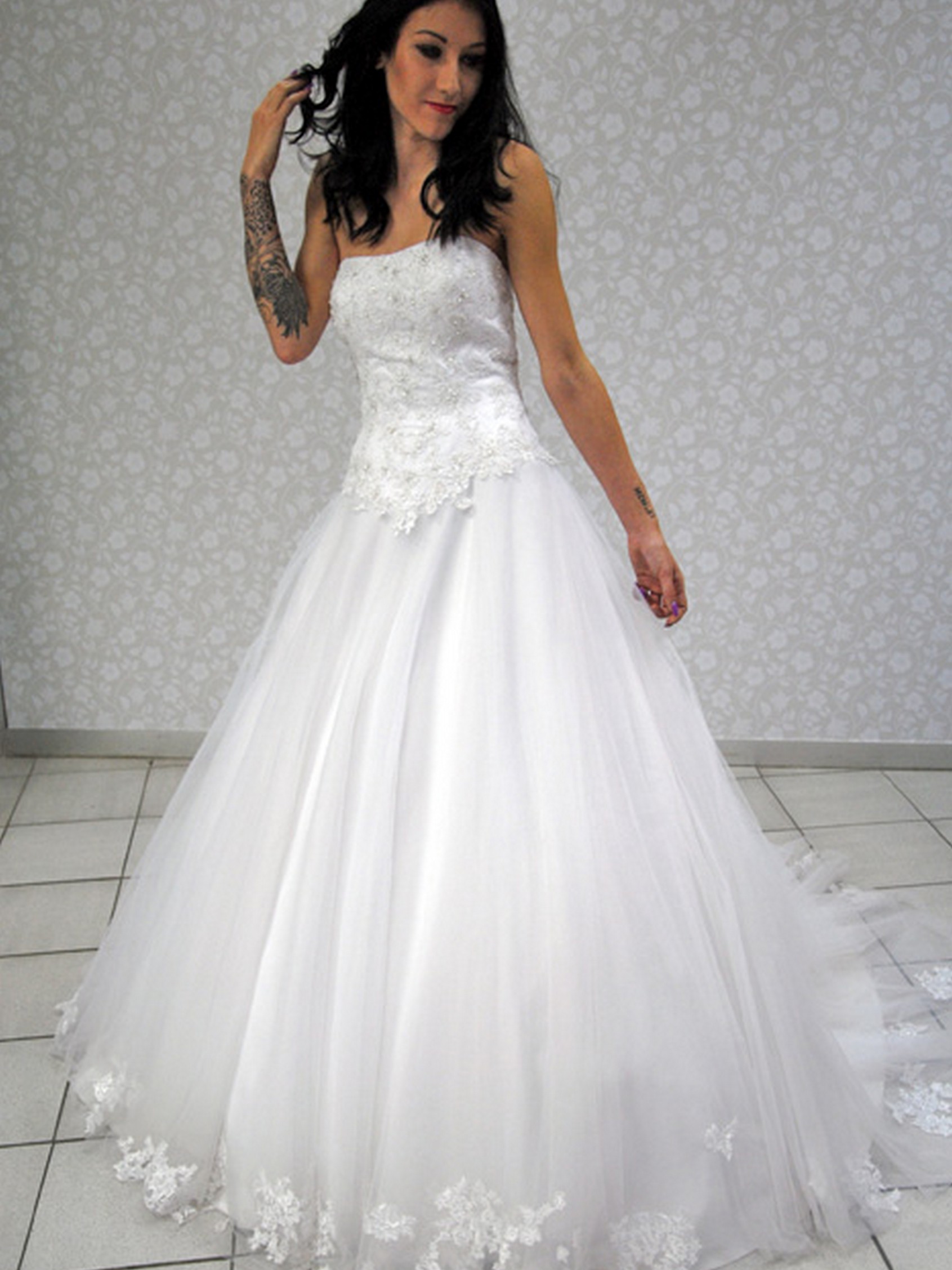 Obleka je iz poročnega satena, zg. del korset z veliko kristalov in čipke, spodnji del princess, ki je zelo razkošen.V tej oblekci boste zasijale, kot pepelka.