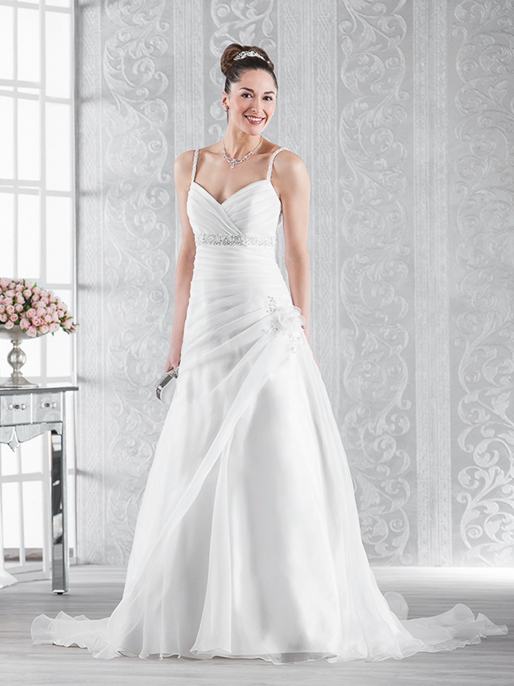 Oblekica je v celoti iz satena in organce, krasijo jo tanke naramnice skristali in perlami, pod oprsjem tanek pas s kristali in perlicami, ob levem boku rožica in posim pkristalov, odzadaj zapiranje na korzet