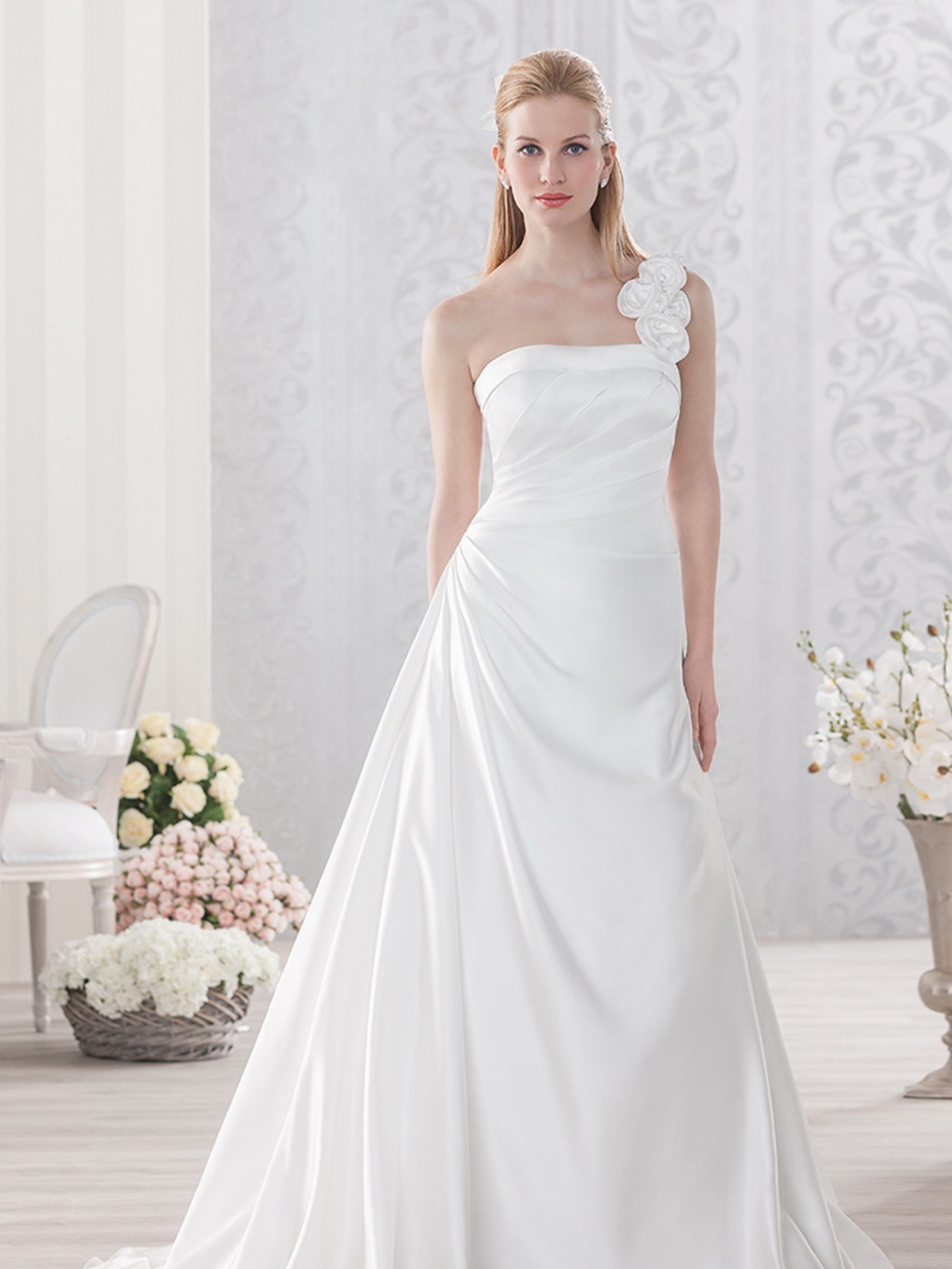 Obleka je narejena iz belega satena, obkleka je zelo klasičnega videza. Po celotni obleki so asimetrične gube, ki skladajo z celotno obleko. Ima srednje naramnice in oprsje srčaste oblike. Obleka je primerna za ženske, ki bodo nosile veliko drugih poročnih dodatkov. Obleka se zapira na korzet in nima vlečke.