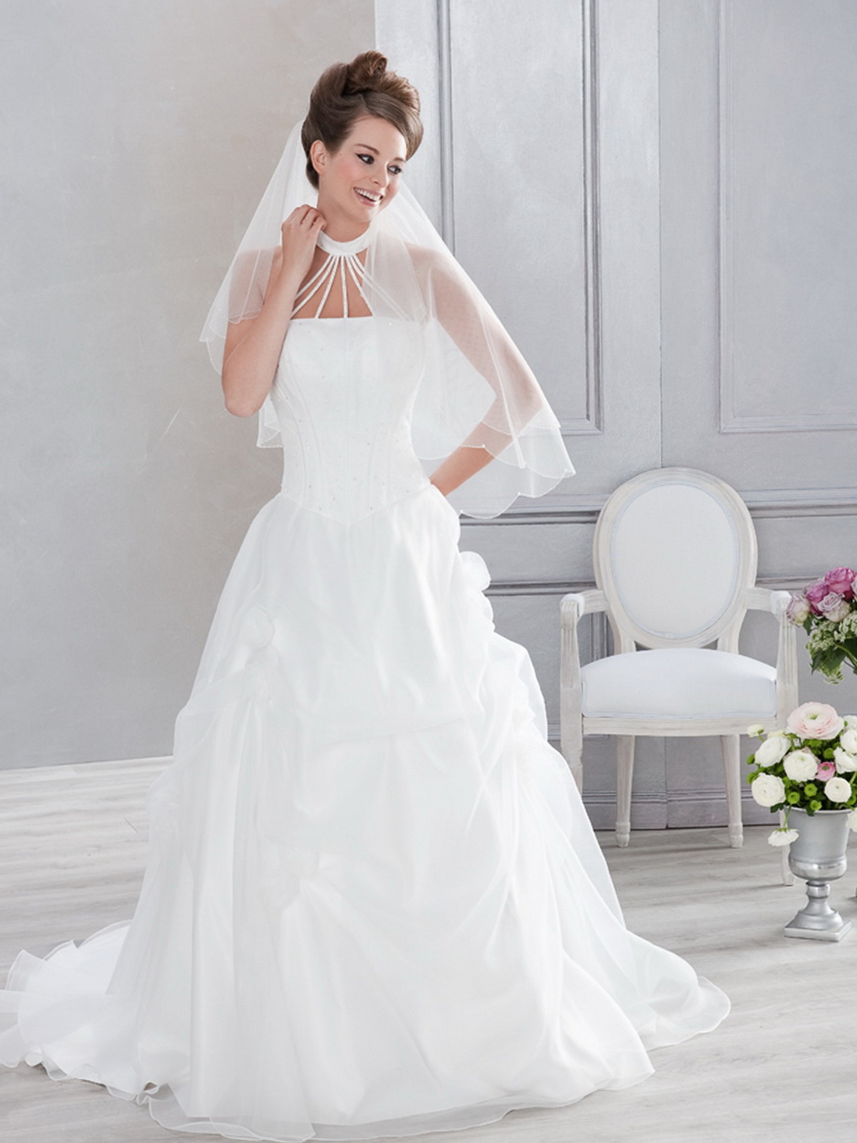 Obleka je v celoti narejena iz bogate čipke in satena. Obleka je zaprta do ovratnika, kjer ima lepo okrašeno čipko.Pod prsmi ima kristale, ki so v obliki rožic. Po celotni obleki je všita čipka, ki daje veličasten videz. Obleka je primerna za neveste elegantnega videza. zapira se na zadrgo in ima bogato čipkasto vlečko.